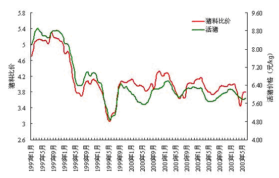 图7 1997-2003年全国活猪平均价格及猪料比价走势