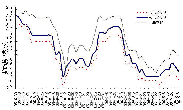 如图1,自2005年9月份外省输入上海生猪价格出现猛跌后,2006年2月份开始再次出现猛跌,并在3月份跌至低谷:三元杂交瘦肉型猪价格跌至6元/公斤附近,河南、山东、江苏等地则跌至5.6元/公斤以下。5月底前在端午节猪肉消费需求增加的拉动下,猪价虽有所反弹,但节日过后,需求回落,猪价便随之再次回落。截至6月份上旬,外省输入上海生猪价格仍然在成本线(三元杂交瘦肉型猪:6.6元/公斤左右)以下。据调查,5月中下旬前后,山东、河北、辽宁、吉林等生猪主产区猪价均跌至2.8/500g以下,浙江、福建等地虽在3.4/500g以上,但成本较高,猪价亦在成本线以下,亏损。
