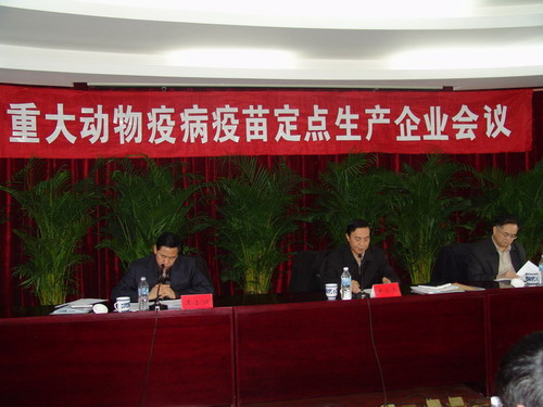 根据农业部第五次常务会议的安排, 农业部于2006年2月16日在中国兽医药品监察所召开了“2006年第一次重大动物疫病疫苗定点企业负责人会议”。农业部尹成杰副部长、国家首席兽医官贾幼陵局长、兽医局李金祥副局长、全国畜牧兽医总站于康震站长、何新天书记等领导和14家重大动物疫病疫苗定点生产企业法人代表出席了会议,中国兽医药品监察所王泰健所长主持会议。