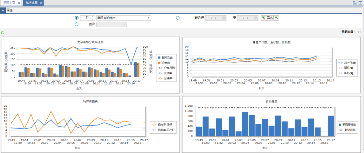 按批次分析结果的主要标准有:产仔率、批次总活仔数和平均活仔数、批次总断奶仔猪数和平均断奶仔猪数、活仔数和总出生数损失率、断奶日龄、平均断奶体重(下图为Pigup中批次数据分析)。