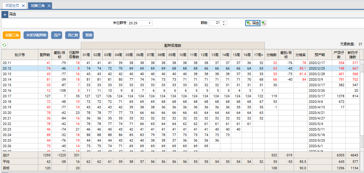 管理者可以用“妊娠三角”选项,每周跟踪所有母猪的变化(下图为Pigup中“妊娠三角”的相关截图)。