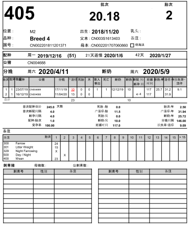 所有的饲养员打印母猪的卡片,放到产房的每头母猪的栏位上。这些母猪卡可以让员工了解前一窝母猪的行为,以便员工根据风险实时监测。例如,如果前一窝产仔困难,那么再次产仔困难的可能性就很高,因此花更多的时间和母猪待在一起是很重要的。如果母猪没有很多奶,最好移走1或2个额外的小猪给其他母猪(寄养)。然后你必须在产房继续监测母猪和仔猪,直到断奶(下图为Pigup中的实体母猪卡)。